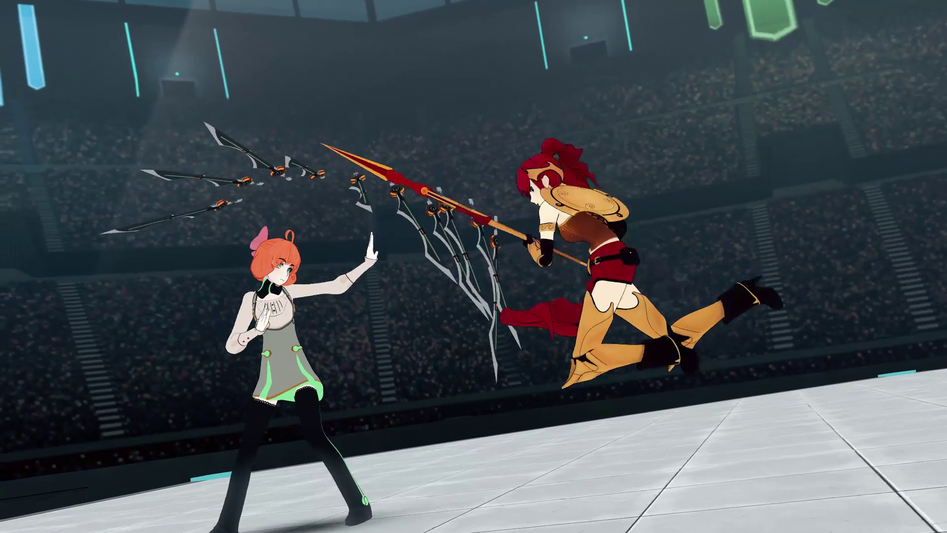 WE GET ARKOS INTO THE NEXT SCENE. They see Cinder arrive at the top of Beacon Tower, with Ozpin MIA. And since even Ozpin is gone, Pyrrha pretty much has no choice but to be the last resort to try to stop Cinder, since she WAS the best candidate for the Fall Maiden powers. Our poor Jaune realizes what's going on and tries to convince Pyrrha not to go fight Cinder, but...